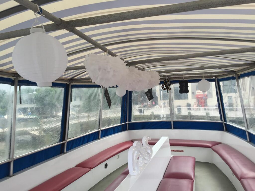 The vessel is arranged with two open-air decks with fixed benches along the perimeter. The main deck is arranged with a beverage bar area on port side and two small restrooms forward along with the helm station. The 01 deck is accessed by a spiral staircase that opens to an open-air viewing area with a canvas top and bench seating.