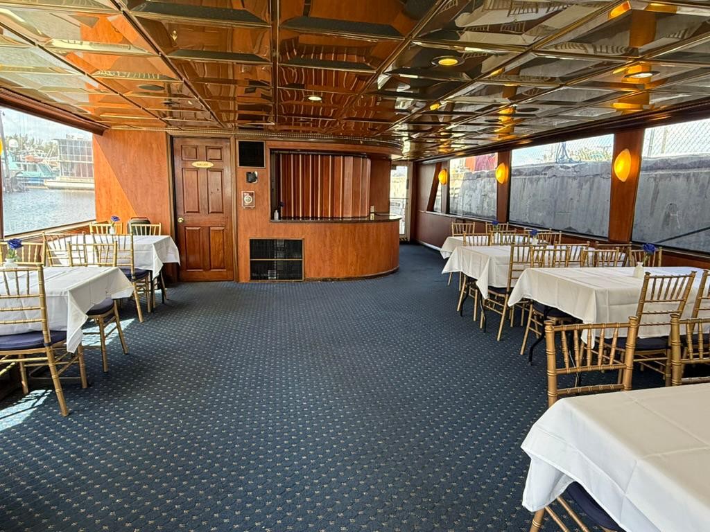 The vessel is arranged with a door off the starboard bow and port stern. The main deck is arranged with a private dining suite with dining throughout a galley aft on starboard with heads abaft of the galley. Access between the main and 01 decks is forward on port (interior) and starboard aft (exterior). The 01 deck allows for the pilot house forward a beverage bar both aft of the wheelhouse on starboard with climate-controlled dining. The fore deck and 01 decks aft offer open-air seating.