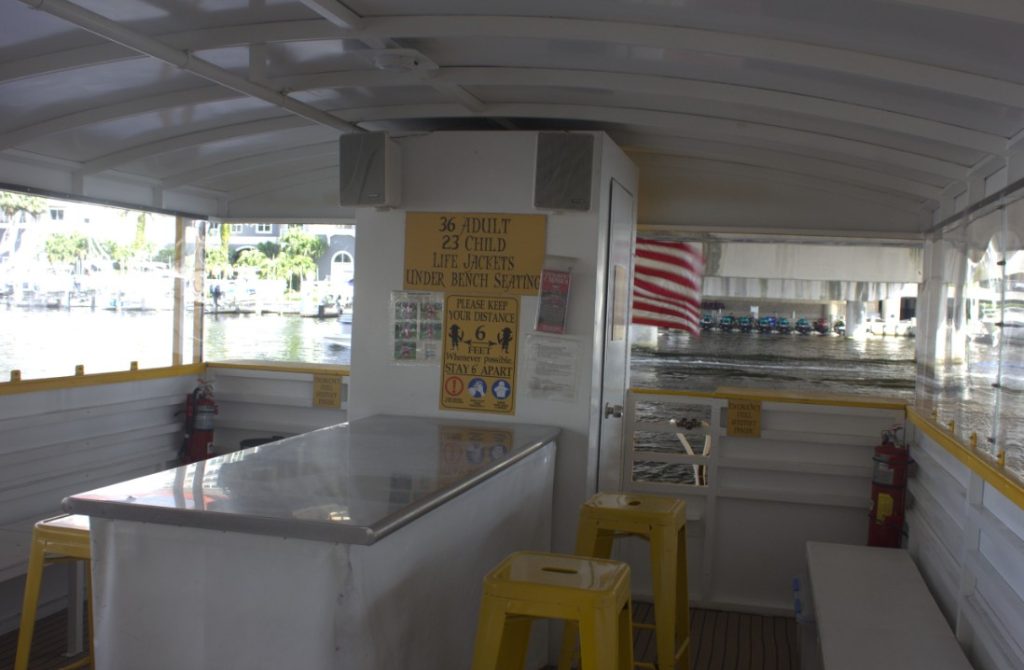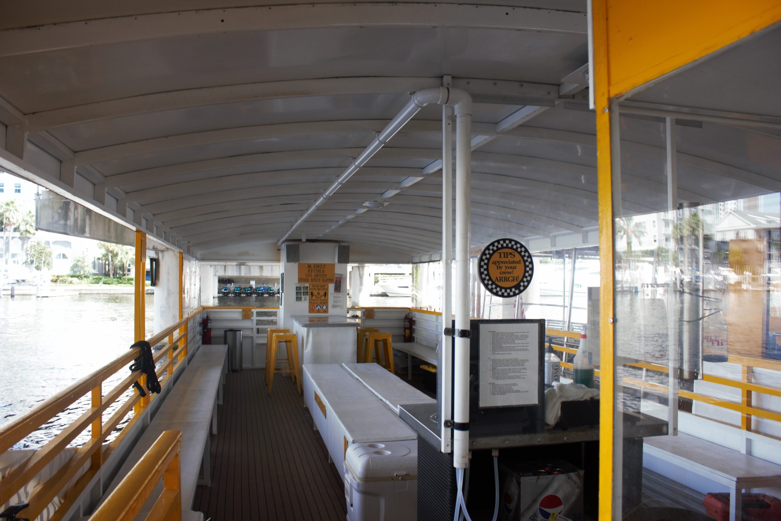 The vessel is arranged with passenger boarding off the foredeck. The helm is forward centerline. The forward cabin has perimeter bench seating and outboard facing bench seating along the centerline. Aft centerline table with bar seating. The head is aft on port.